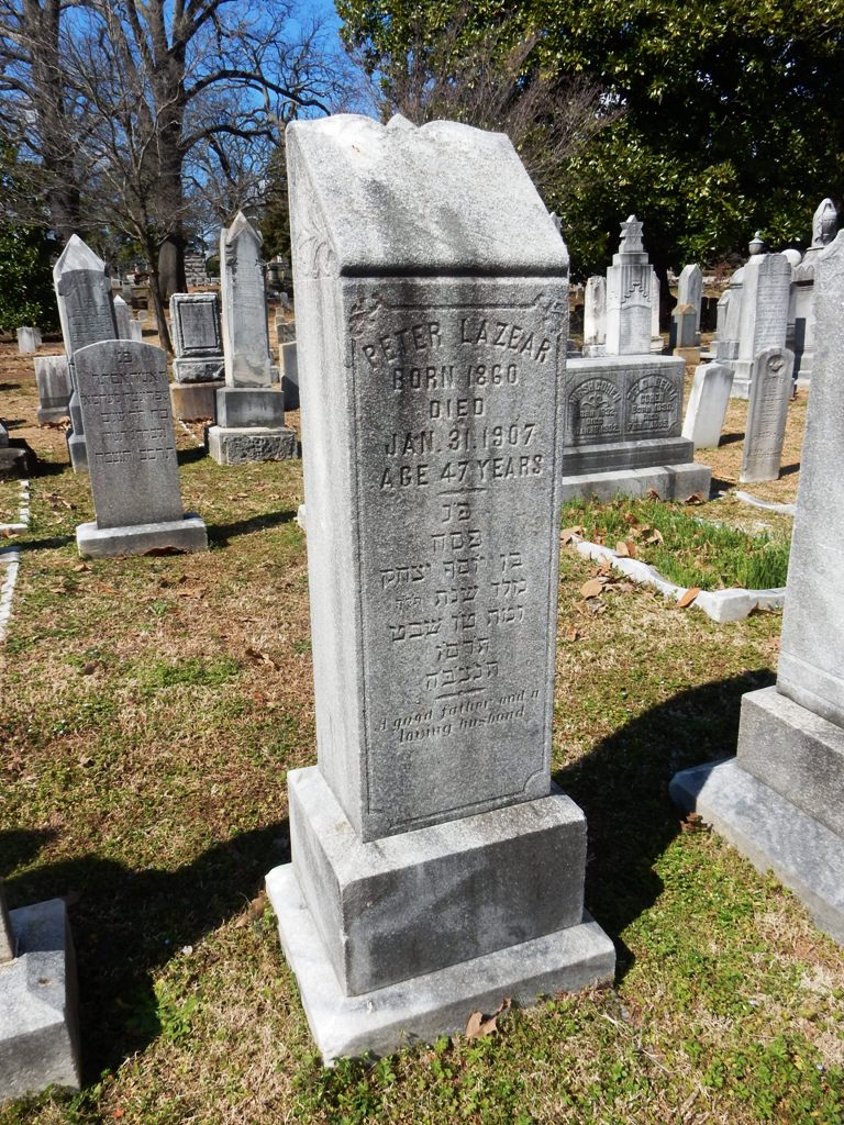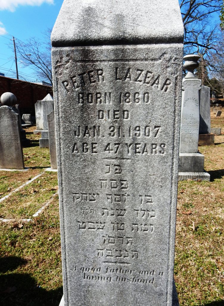 Peter Lazear left behind a legacy of dedication and perseverance. He was laid to rest in Oakland Cemetery, Atlanta. His gravestone, inscribed in both English and Hebrew, reads “A good father and a loving husband” and “May his soul rest in peace,” reflecting the deep love and respect his family and those who knew him best had for him.
