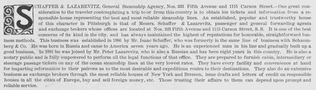 Schaffer & Lazarevitz, General Steamship Agency, Nos. 223 Fifth Avenue and 1115 Carson Street.-One great consideration to the traveler contemplating a trip to or from this country is to obtain his tickets and information from a responsible house representing the best and most reliable steamship lines. An established, popular and trustworthy house of this character in Pittsburgh is that of Messrs. Schaffer & Lazarevitz, passenger and general forwarding agents and exchange brokers whose offices are located at Nos. 223 Fifth Avenue and 1115 Carson Street, S.S. It is one of the best concerns of its kind in the city, and has always maintained the highest reputations for honorable, straightforward business methods. This business was established in 1886 by Mr. Isaac Schaffer, who was formerly in the same line of business with Schaumberg & Co. He was born in Russia and came to America seven years ago. He is an experienced man in his line and gradually built up a good business. In 1891 he was joined by Mr. Peter Lazarevitz, who is also a Russian and has been eight years in this country. He is also a notary public and is fully empowered to perform all the legal functions of that office. They are prepared to furnish cabin, intermediary or steerage passage tickets on any of the ocean steamship lines at the very lowest rates. They have every facility and convenience at hand for imparting information to their patrons as to the most desirable and expeditious routes to their destinations. They also do an extensive business as exchange brokers through the most reliable houses of New York and Bremen, issue drafts and letters of credit on responsible houses in all the cities of Europe, buy and sell foreign money, etc. Those trusting their affairs to them can depend upon prompt and reliable service.