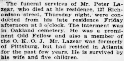 The funeral services of Mr. Peter Lazear, who died at his residence, 127 Richardson street, Thursday night, were conducted from his late residence Friday afternoon at 3 o'clock. The interment was in Oakland cemetery. He was a prominent Odd Fellow and also a member of the O.K.O.J. Mr. Lazear was formerly of Pittsburg, but had resided in Atlanta for the past few years. He is survived by his wife and five children.88