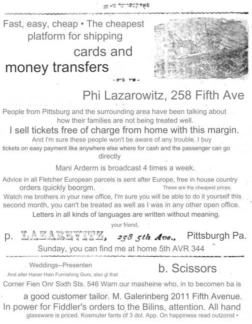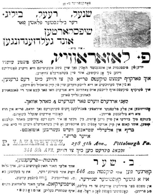 Jacob S. Feldman was a historian native to Ellwood City, Pennsylvania, who wrote two books about the history of Jewish people in Pittsburgh, Pennsylvania. He interviewed Peter’s brother, Max. He wrote about Peter Lazarevitz (later Lazear) and his involvement in the foreign exchange business in Pittsburgh. In 1899, Peter and a competing agent, A. Mozersky, began advertising their foreign exchange agencies in the Volksfreund, a new Yiddish weekly printed in Pittsburgh. They primarily solicited business from the local East European Jewish community, among whom they lived.